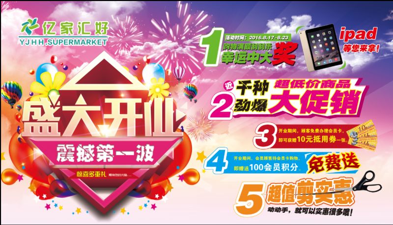 活動內容:活動期間凡在億家匯好超市區(qū)購物的顧客,憑海報剪角可購得相對應位置超值商品一份,實惠多多,敬請選購?。▎螐埣艚窍奘褂靡淮危?/span>